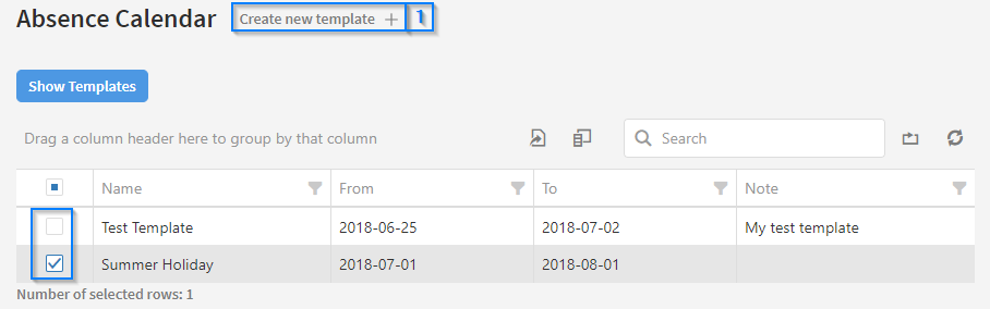 To see the details of one or more absence templates, select them by ticking the checkbox in the leftmost column as shown in the screenshot. The 'Show Templates' button will now be available. Click it to open up the Absence Template Details page.