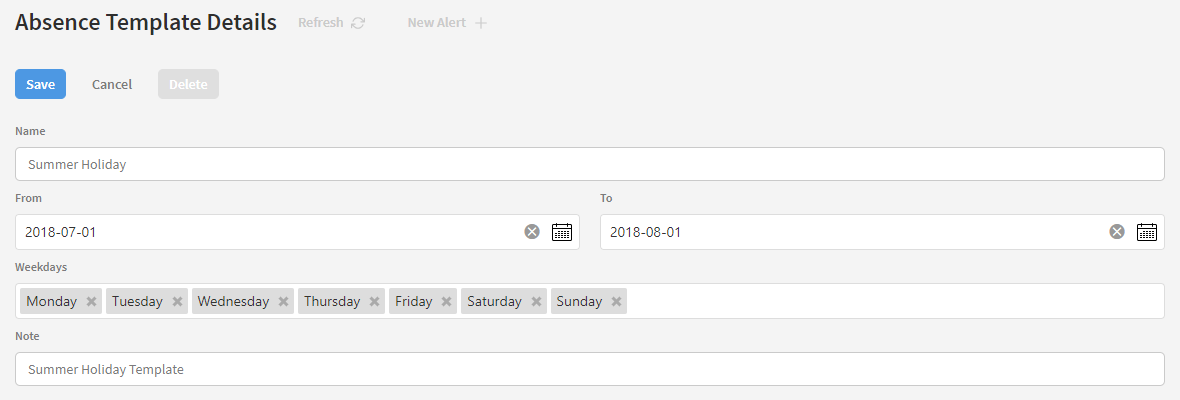Click this to delete the currently opened absence template. A prompt asking you to confirm your choice will be shown.