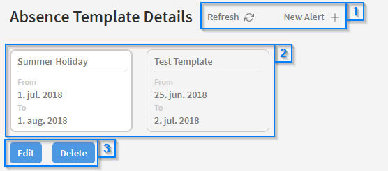 You can use absence calendars to create absence templates for your alerts. This is useful if you have many alerts configured, which need to have the same absence settings. On the absence calendar page you can get an overview of all configured absence templates. Note: The 'Refresh' and 'New Alert' buttons in the upper part of the page are disabled when creating absence templates.