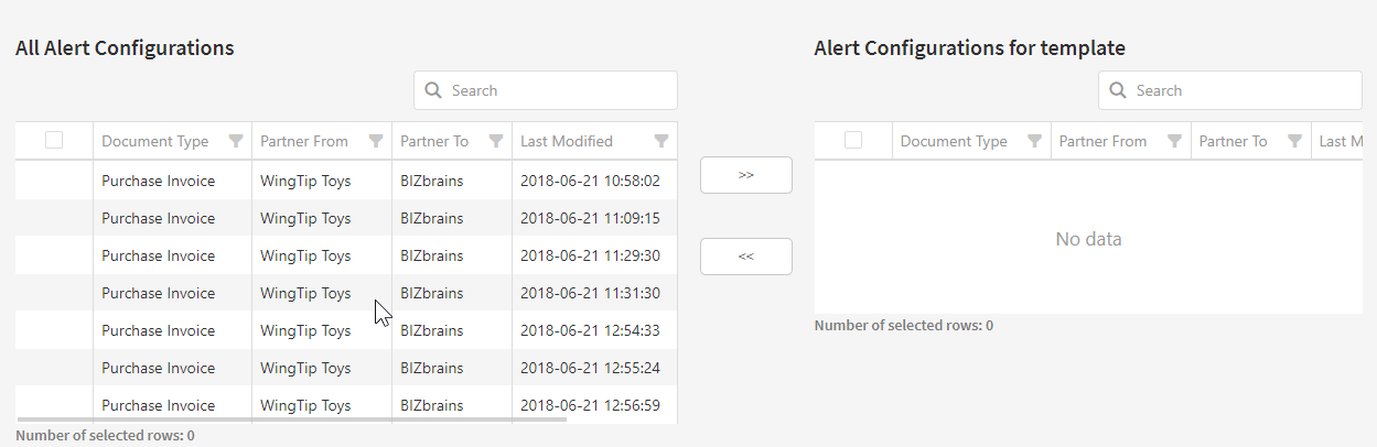 After you have filled in the text fields, you can proceed to select the alert configurations which should have this absence template applied. In the lower half of the page you can see a list of all alerts in your Link solution to the left. Select the alerts you wish to apply this absence template to and click the arrows to confirm. You can also use the search fields to find specific alerts. See the animation below for reference.
