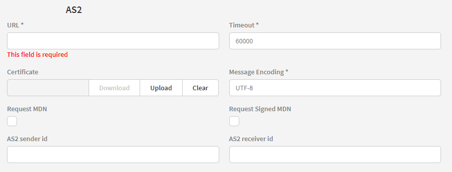 Here you supply the AS2 URL, a timeout, and message encoding.