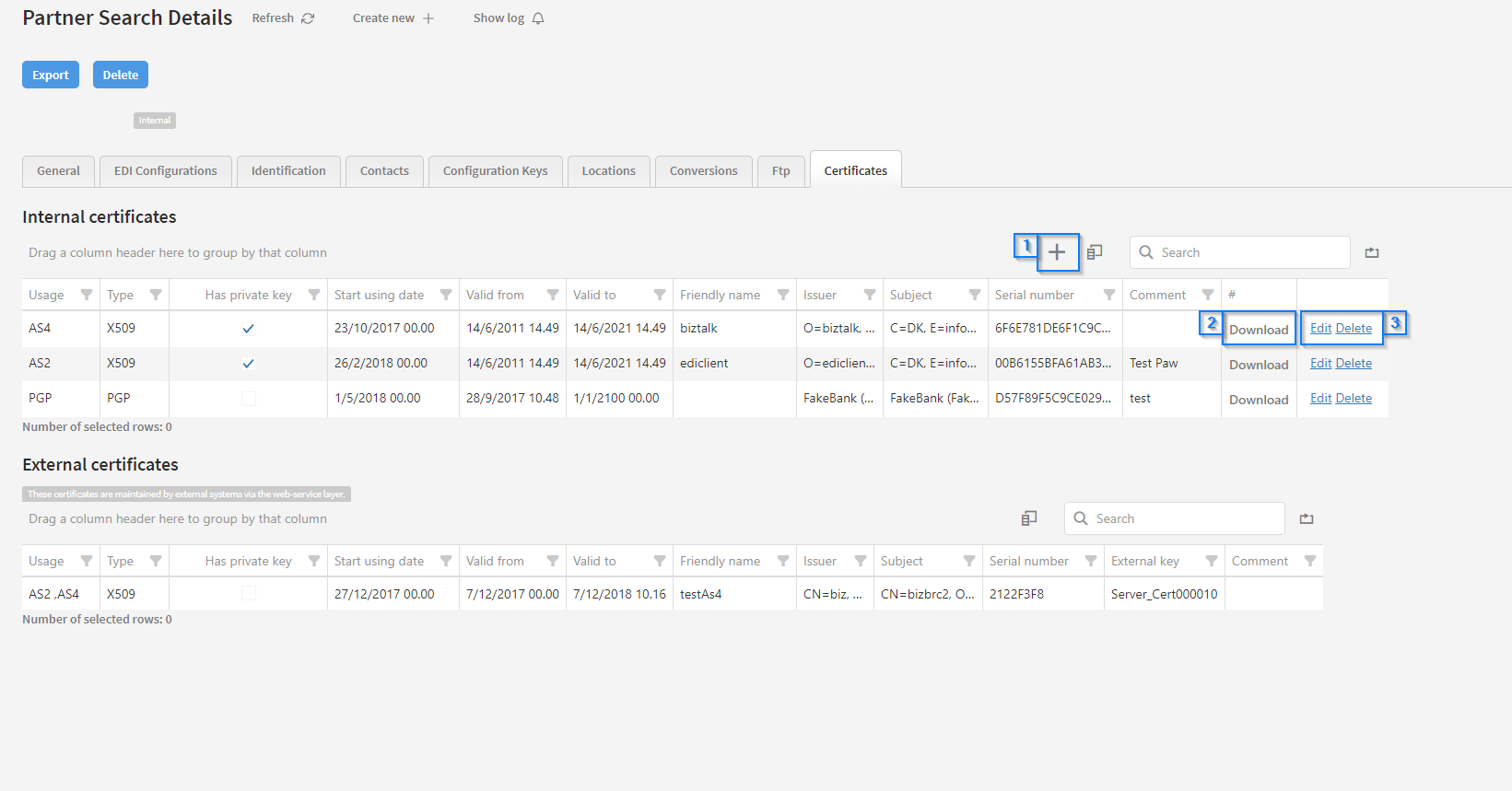 This tab contains the certificate store. Here we can store certificates for many purposes, eg. AS2, PGP and AS4 which is used in the locations tab when setting up AS4 connections.