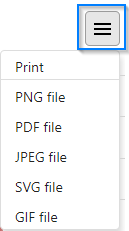 To print or save a chart, press the navigation drawer icon in the top right of each chart. You can then either print the chart, which will open the print dialog, or save it as one of five different image formats.