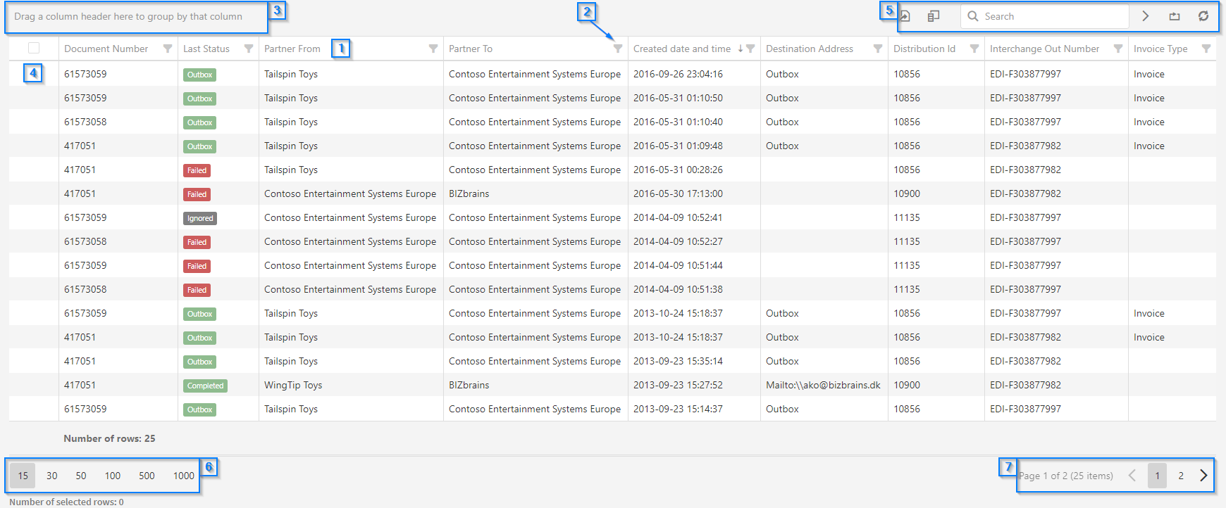 Whether you are looking up documents, distributions, users etc. you will encounter data grids. They contain rows of data and supports basic data handling operations such as sorting and filtering. The basic functionality of these data grids will be described in detail on this page.
