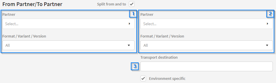 Use these filters to select an exact To and From partner, as well as the sending and receiving formats. The partner filters work the same way as explained in the 'From Partner/To Partner' section on this page. The From partner [1] can be specified in the first box, and the To partner [2] can be specified in the second box.