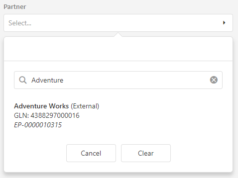 When you start writing, any partners that match the search term will show up below the search box. You can select the partner from here, which will close the search window. Select clear to reset the partner search.