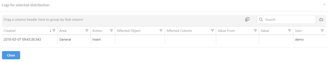 Press this to be shown a pop-up of the distribution log. This will contain all the actions that have been performed on the distribution. See the 'Show Log' page in the user guide for more information about the different columns.
