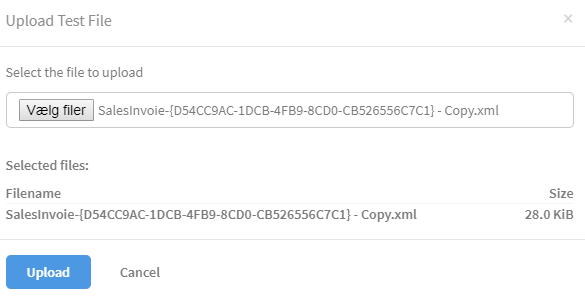 This allows you to manually process a testfile through the normal handling of the document as if it was processed automatic. When you press the button, a pop-up allowing you to choose a local file will be shown. After selecting a document, some information about the document will be revealed as shown in the screenshot below.