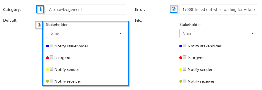 Each error can have one or more stakeholders, one for each document type. The colors represent who will be notified and whether the message is urgent. Let's take the example below.