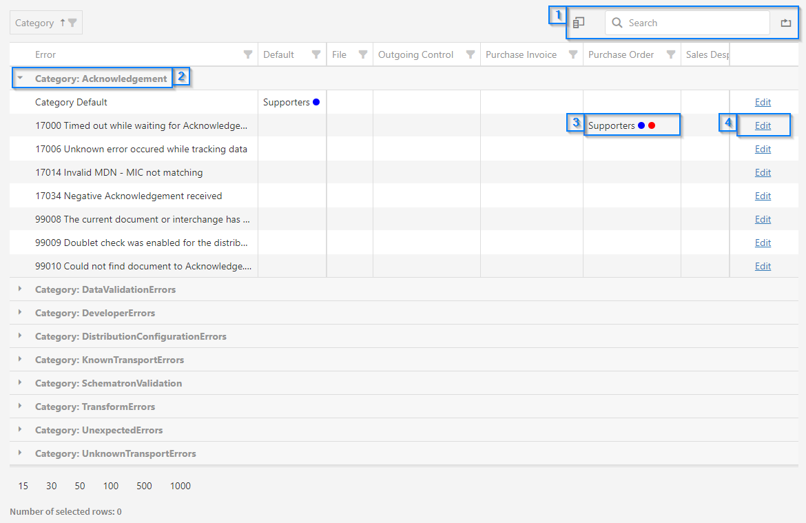 As the data grid on the error handling page is set to be grouped by category by default, some standard data grid operations may not be available.