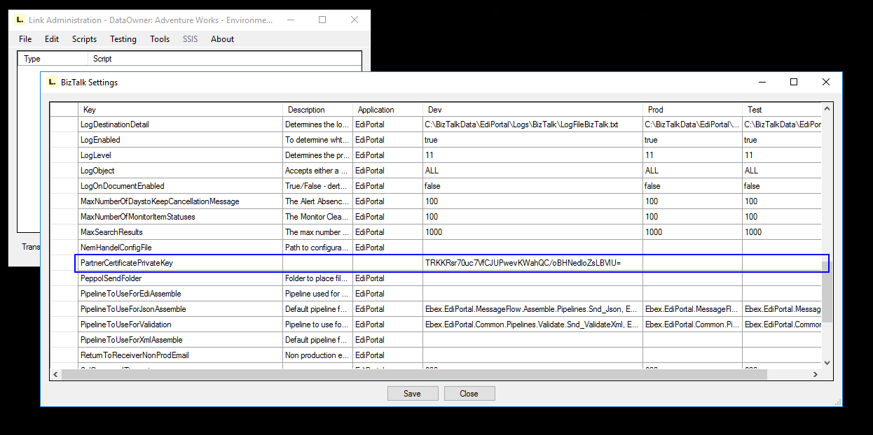 Look for PartnerCertificatePrivateKey in the Key column. I you don't find PartnerCertificatePrivateKey, insert it at the bottom.