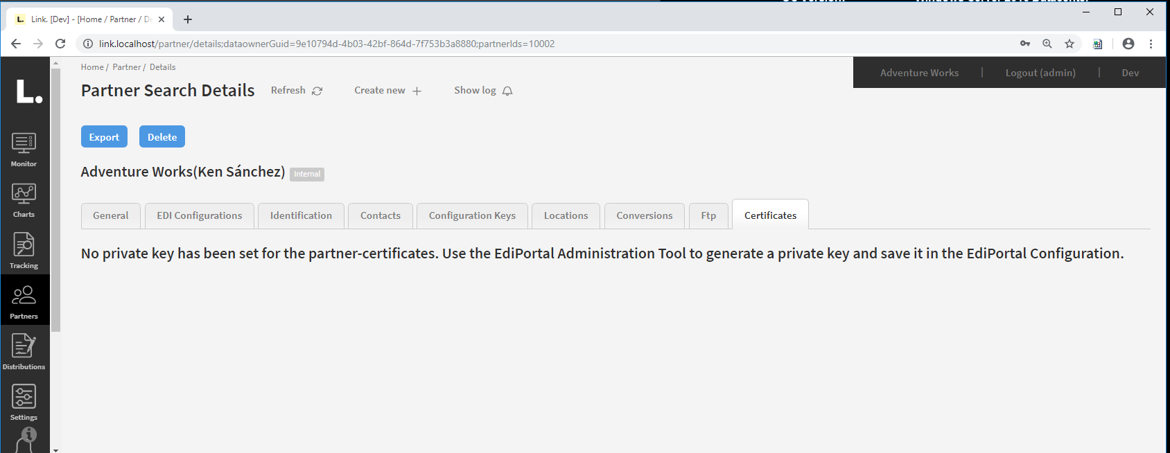 No private key has been set for the partner-certificates. Use the EdiPortal Administration Tool to generate a private key and save it in the EdiPortal Configuration.