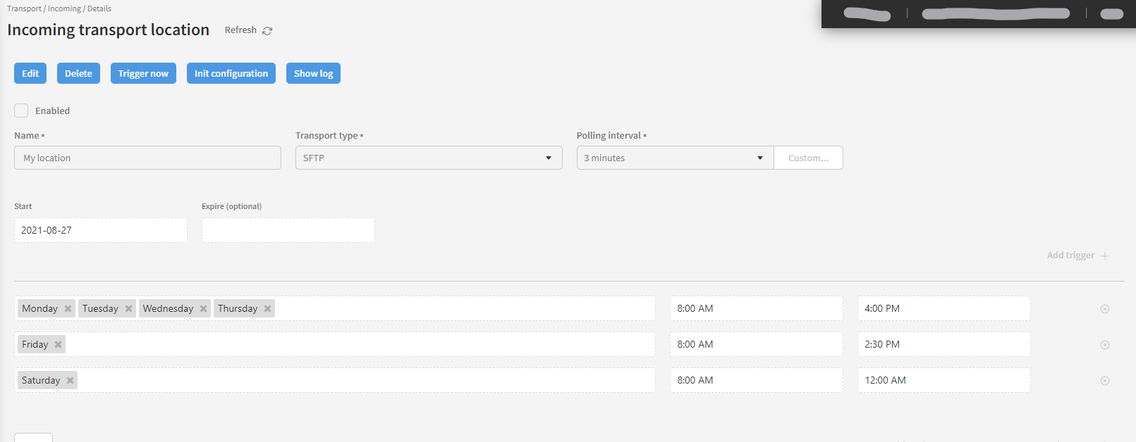 Click 'Add trigger +' to add a trigger period. You can add any number of triggers. The triggers define the periods when the location is polled. When a trigger period begins the polling commence on the interval defined above. When a trigger period ends, the polling ends as well. When evaluating active periods, all trigger periods are combined and is does not matter is multiple triggers overlap.