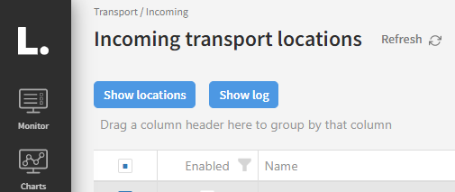 Incoming transport locations describe locations where the Link will pick up business documents send them through Link. There are numerous way to setup the locations, the kind of transport in use, where and when to look for documents. Click or press the 'Transport' menu item to open the 'Incoming transport locations' overview.