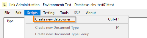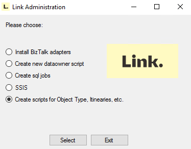 The Link Administration Tool is used for installing databases and some required Biztalk adapters for Link. It is also used to create a variety of entities to use in integrations running on Link. It automatically generates SQL script based on the given inputs, which makes it easy to deploy changes to other environments.