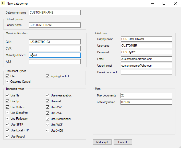Click on the "Create new dataowner", then new data owner window pops up. The sample data owner, CUSTOMERNAME is defined below. It has Default partner as CUSTOMERNAME, identification as GLN, mutually defined, document types, transport types, user and Miscellaneous.