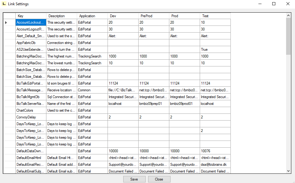 Link Settings contain numerous configuration values that the Link uses. For each key there is value for each possible staging environment of BizTalk and the Link.