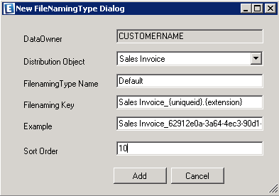 It provides to create new file naming type based on distribution. The new file naming type, Sales Invoice_{uniqueid}.{extension} for Sales Invoice distribution and dataowner, CustomerName. The following figure shows that creating new type.