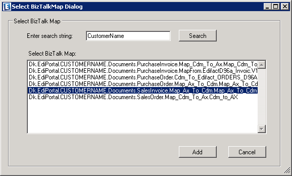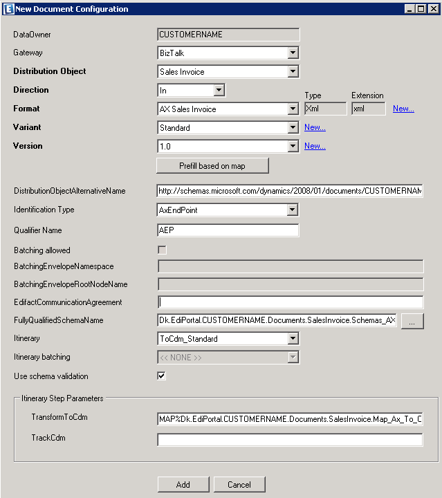 - Prefill based on map button: Click on this, it populates window to choose the BizTalk map. Using this, some of the properties are going to fill automatically. They are DistributionObjectAlternativeName, FullyQaullifiedSchemaName, Itinerary and Itinerary Step parameters. These values are editable. It is defined as below.