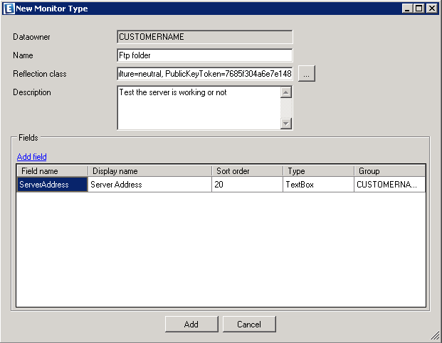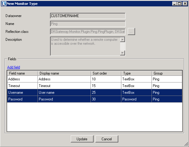 It provides to create a new monitor type. It is a reflection class, which should be derived from the base class, DKGateway.EdiPortal.Common.Monitor.External.MonitorPlugin. For example, we want to create Ping monitor type. It is used to ping the server is working or not. The following figure shows that sample ping moniter type. It has data field, ServerAddress, which is type of Textbox.