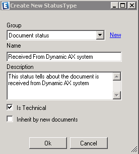 It provides to create new status type for DocumentFlow, DocumentStatus group. This user interface is defined as below. It shows about how to create a new status type, "Received From Dynamic AX system" for a group, Document status.