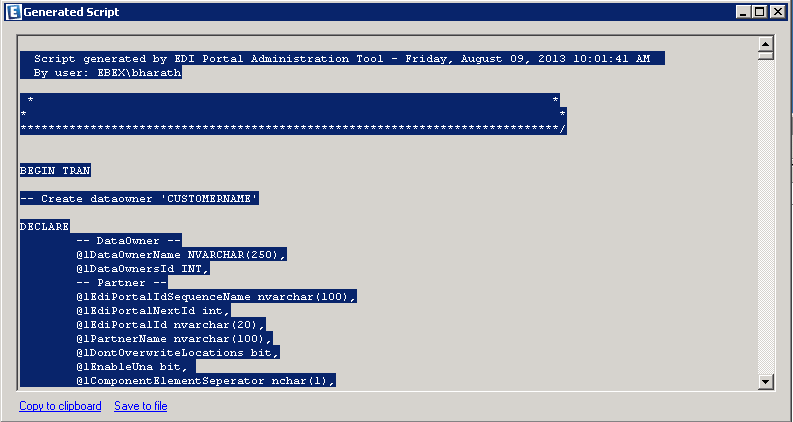Then the new window, 'Generated Script' will pop up. It is shown as below. It contains SQL script, links 'Copy to clipboard' or 'save to file'. If we click on save to file option, pop up with 'Save As' Dialog. Then give the file name and press the button 'Save'. Hence it is created and able to run on SQL database.