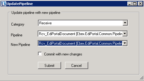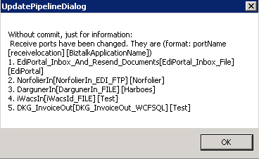 It does update pipeline with new pipeline of send or receive ports in BizTalk applications. Main objective is replacing the latest version of pipeline in all send or receive ports. It is going to be automatically and saves the time and also more accurate. The following figure shows that replacing latest version of Rec_EdiPortalDocument pipeline.