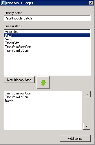 It provides to create new itinerary and itinerary steps for dataOwner. For example, we want to create a new itinerary, Passthrough_Batch. It has three itinerary steps. They are TransformFromCdm, TransformToCdm and Batch. Use arrow buttons, ^ ˅ to give the execution order in itinerary steps (Number 1 starts from top). The following figure shows that PassThrough_Batch iternary.