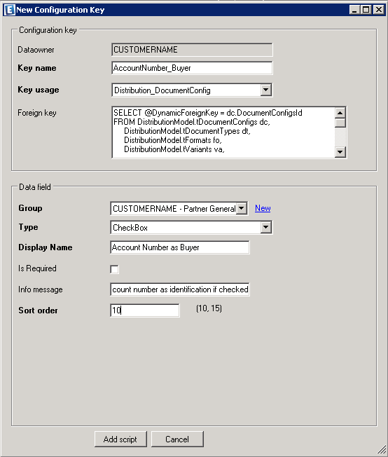 For example, if we have multiple identifications either GLN or AccountNumber of a Buyer for a distribution, Sales Invoice. Then we can able to create configuration key as checkbox, AccountNumber as Buyer. The following figure shows that it.