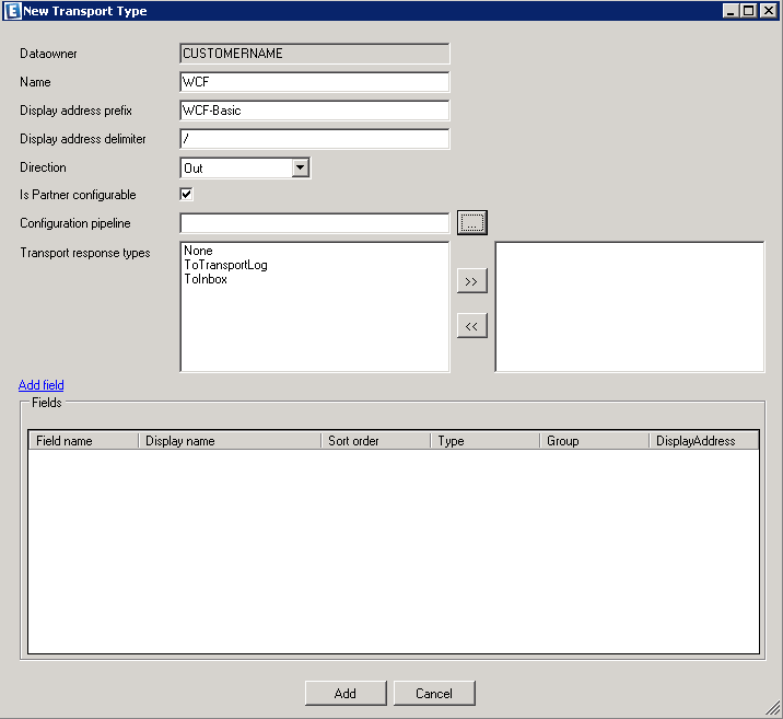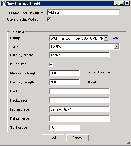 It provides to add transport fields for transport type. It can be added in two ways. The first is while creating a new transport type, use "Add fields" link. The second is adding new transport files if transport type is already created. For example, we want to create new address transport type filed for WCF transport type. It is defined as below.
