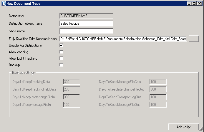 It provides to create a new document type based on inputs. It is defined by name, short name, fully qualified Cdm Schema name and other properties. It can be used for distribution and able to set allow caching; allow light tracking and backup settings. The following figure shows that creation of 'Sales Invoice' document type for dataowner, CUSTOMERNAME.