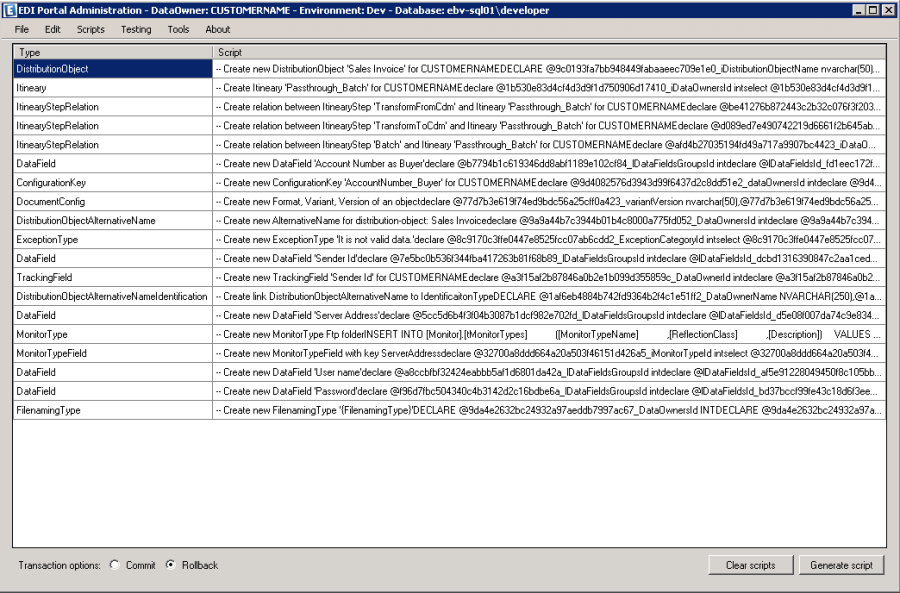 The middle of the view contains an overview of the entity creations that will be added to the script being generated. You can add a sequence of entities through the "Scripts" selection in the top header menu. Once you have added all the entities you need, you can then generate a SQL file, which will contain the logic for creating all the entities you have specified.