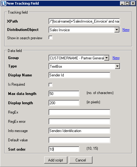 It provides to create a new tracking filed based on XPath and distribution Object. The property, Show in search preview is checked, means that it shows in Tracking in Link. The following figure shows that sample tracking field, Sender Id of Sales AX Invoice.