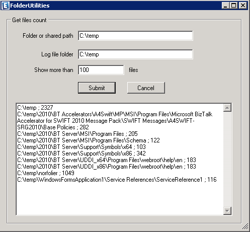 It provides to able to search the folders either in folder or share path, which are having more than files count. This is very useful to find out which folders are having more files. For example, if you want to know that my folder may contain more than 100 files includes all subdirectories. The result are in format of folder path ; filesCount . And also writes the same information into log file. This user interface is defined as below.