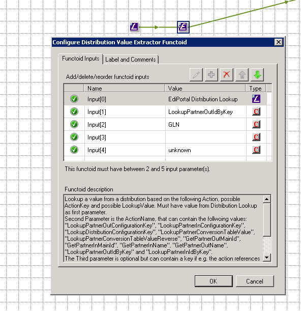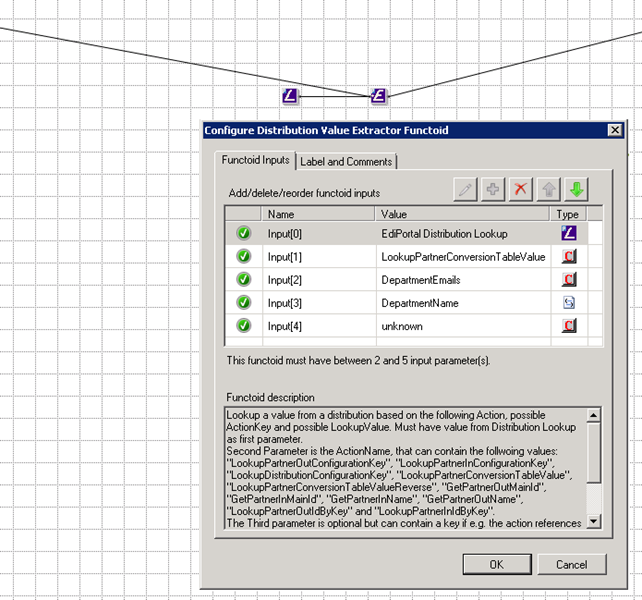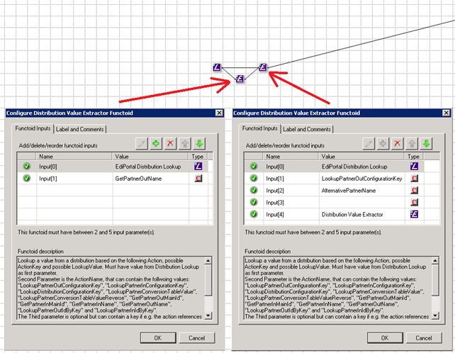 These two functoids can be used to lookup data related to the current distribution, which includes the sender and receiver partner. The lookup functoid is parameter less. It fetches the necessary data from the context layer of the input message and looks up the distribution from the Link database. Its output can then be used as input for the extractor functoid, where it is possible to specify what data you want to extract.