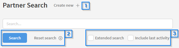 The first part of the page contains options for searching and creating new partners. Each of the options will be explained in detail below.