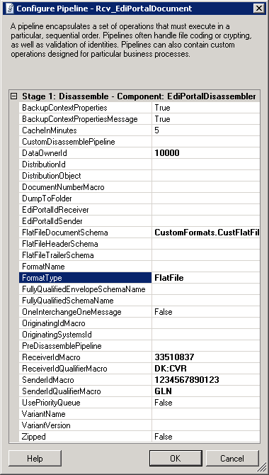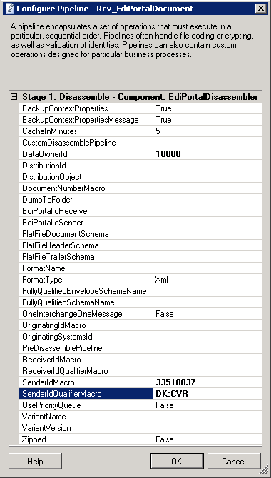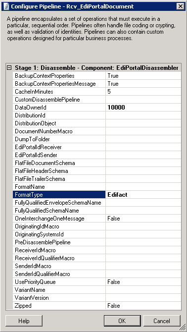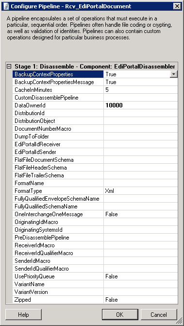 The disassembler component supports disassembling XML, EDIFACT as well as flat file based formats. If there is a need to disassemble other formats, the fully qualified name of a receive pipeline can be specified here, and it will be invoked from within the EdiPortalDisassembler component. - DataOwnerId.