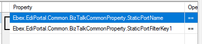 Can be used to refer to at static port in BizTalk server. The Static port must have a filter that reference the same name you setup in Link. E.g. Ebex.EdiPortal.Common.BizTalkCommonProperty.StaticPortName == ToVans- In case you need to divide into different staticport you have the option of promoting a value from the ingoing document to Link common property schema Transport, with name "StaticPortFilterKey1" (or StaticPortFilterKey2) and you can then use this property on your send port as well to subscribe to in case you need to hit a different staticport depending on a value in the ingoing document.