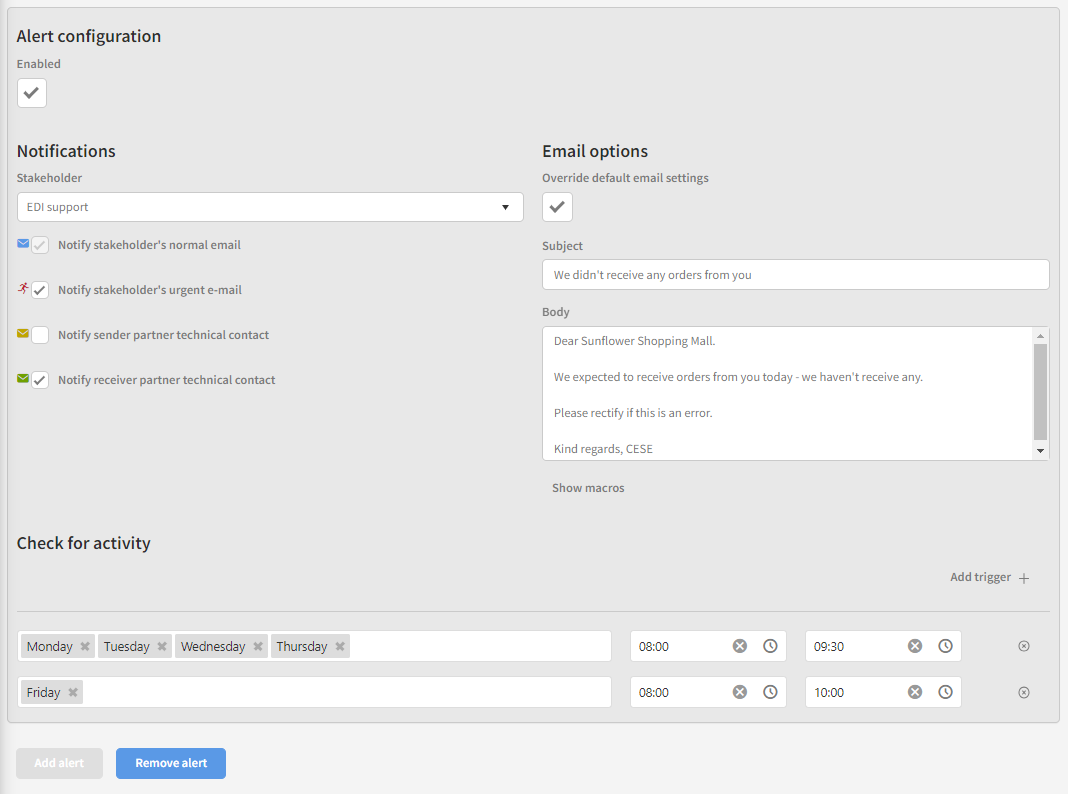 The screenshot below shows an example of an alert that sends notifications to the EDI support stakeholder and the receiver partners technical contact and that marks the emails as ‘Urgent’.