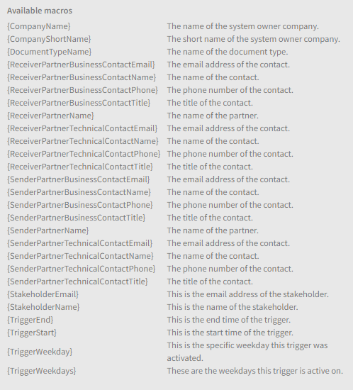 When building your email subject and body, it is possible to use macros to make the content dynamic. If you click ‘Show macros’ you will be presented with a list of available macros with a short description.
