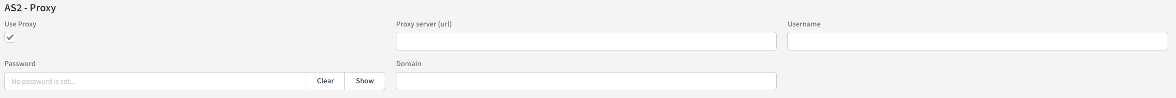 If you select this checkbox, you will be prompted to enter Proxy server URL, Username, Password and Domain information for the AS2 proxy.