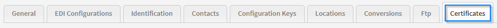 This tab contains the certificate store. Here we can store certificates for many purposes, eg. AS2, PGP and AS4 which is used in the locations tab when setting up AS4 connections.