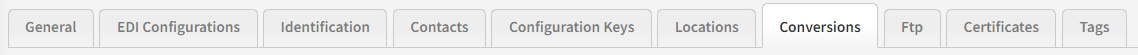 From the Conversions tab you can create universal or partner-specific conversion tables containing key-value pairs that can be utilized by your in-built document conversions (maps). The main idea is to avoid hard-coded values in your document conversions and to make your mappings as reusable as possible. Read more in the Make your integrations reusable article.
