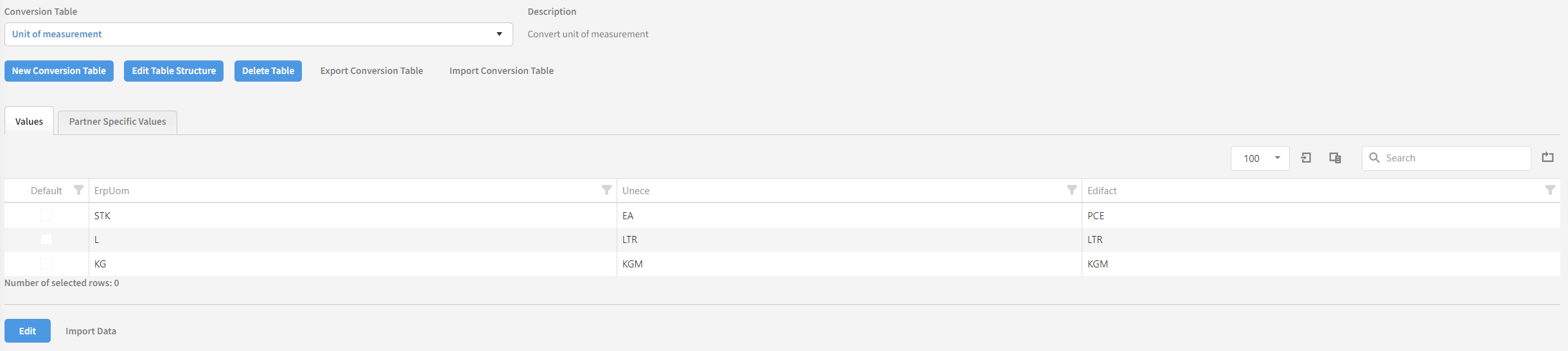 Click the dropdown to see a list of all universal (global) and specific conversion tables for this partner. The universal (global) tables are marked in blue, while the partner specific tables are not. Selecting a table from the dropdown will display it in the data grid.