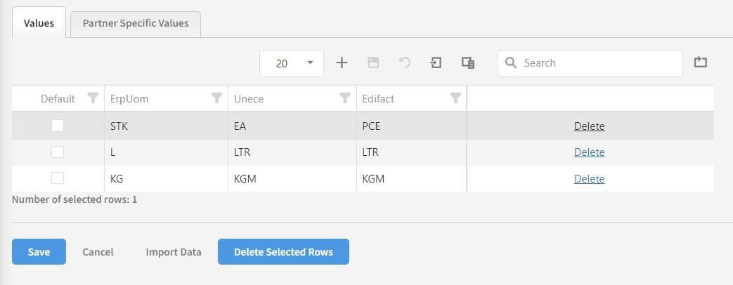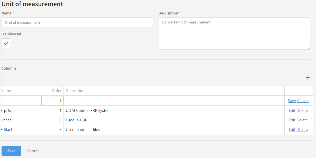 For example, we can imagine that your ERP system needs a unit of measure in a specific format, for example ‘PCE’ for ‘pieces’, but your partner might supply it as ‘Pieces’. We can then create a unit conversion table that can be accessed from the document conversion. The user can also easily add additional conversions, such as ‘Packages’ being converted to ‘CLL’.