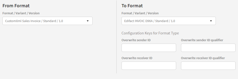 The format section contains information about the sending and receiving format. Here you can specify the exact format/variant/version of both the incoming and the outgoing message.