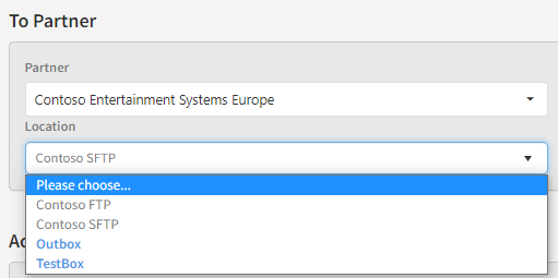 In the "location" dropdown, you can select between all locations that exists on the selected partner and it's also possible to select a global location. You can read more about this in the Outgoing locations chapter.
