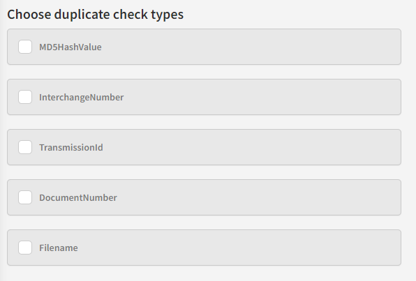 Note that four of the duplicate check types are simply comparing document field values (interchange number, transmission id, document number and filename) - these are described in the Document detail page article.
