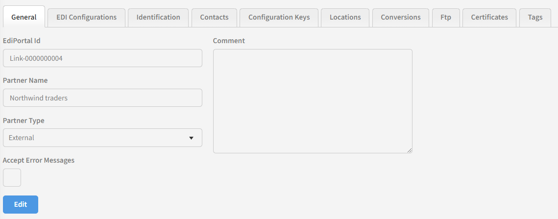 The type of the partner can be changed here. In Link, there can be two different types of partners: internal andexternal. An internal partner is an endpoint (typically of an application) within your organization. External partners are your business partners that you are exchanging data with.