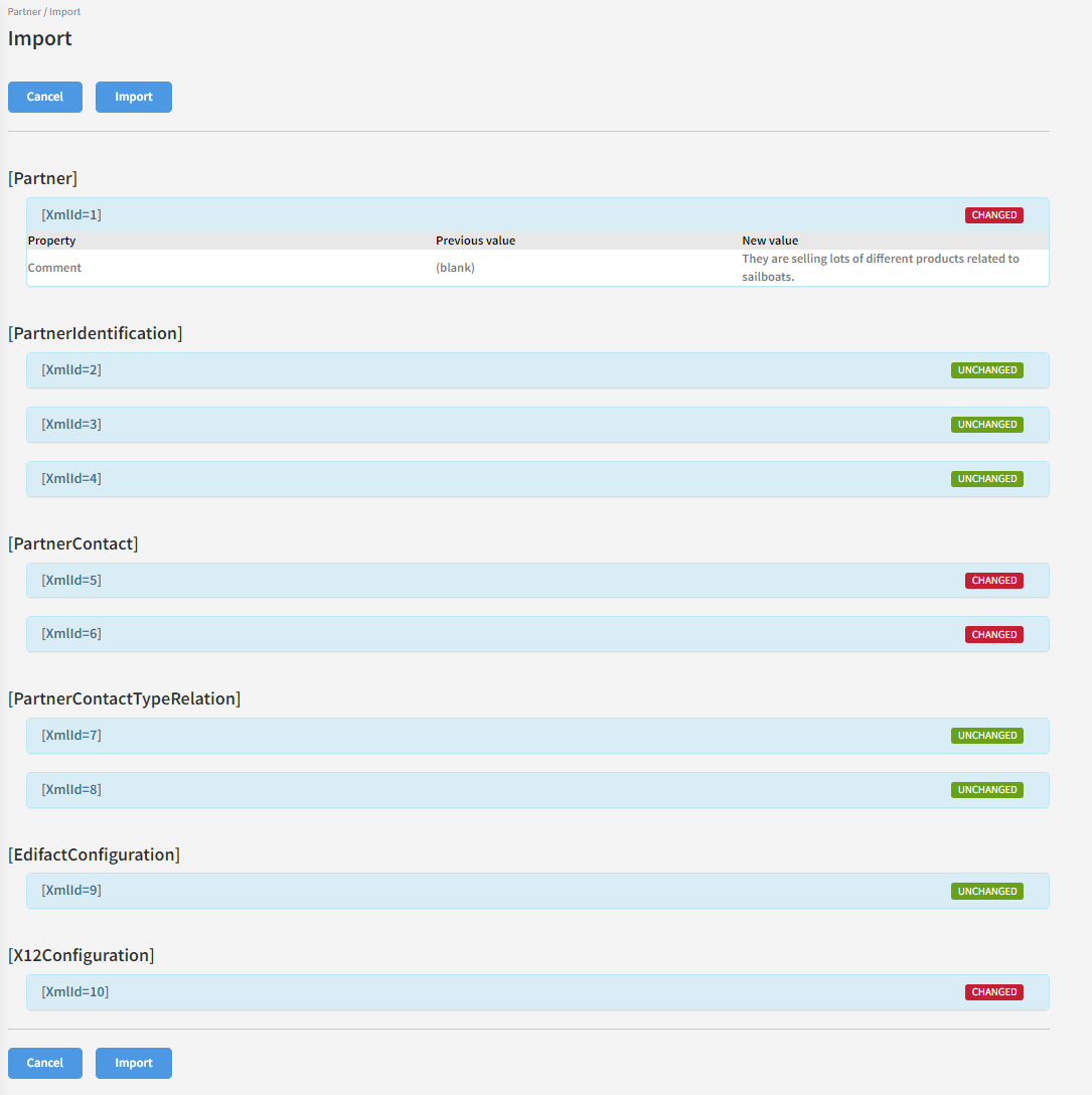 After loading the file, you will see a report, showing what has been changed in relation to before the import. You can click each item to view details - in this example, the partner comment was updated.